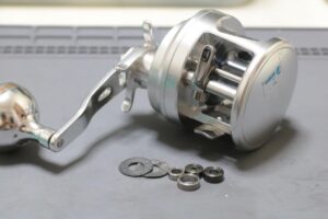 真鍮製のブッシュでメインシャフトを受けて、ベアリングは入っていないのですが、スプールの駆動はスムーズですし、メインシャフトに接触しているローターナット部にスレ感や巻き重り感が無いです。