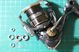 ベアリングとボディのツラを合わせる為にシムを入れます。ガタツキを取るために0.1mmのシムが2枚入っていましたが、0.3mmと0.05mmのシムに交換します。