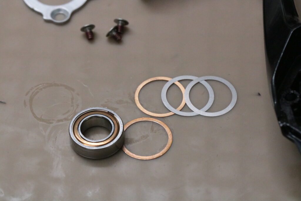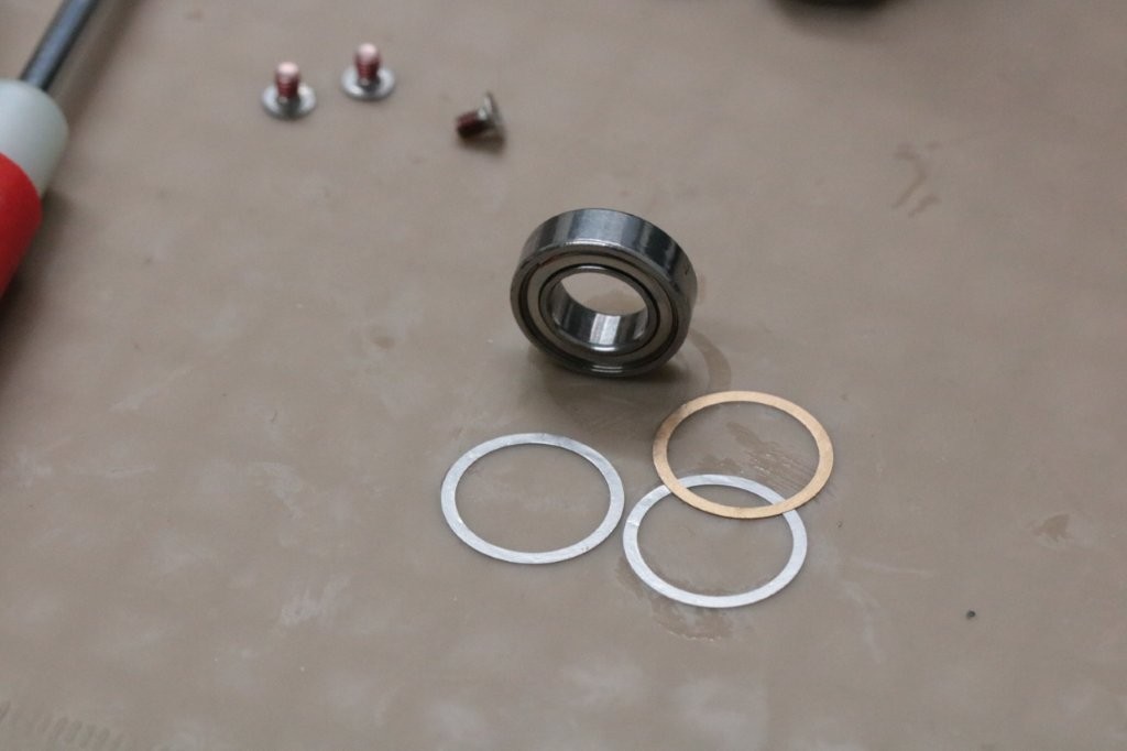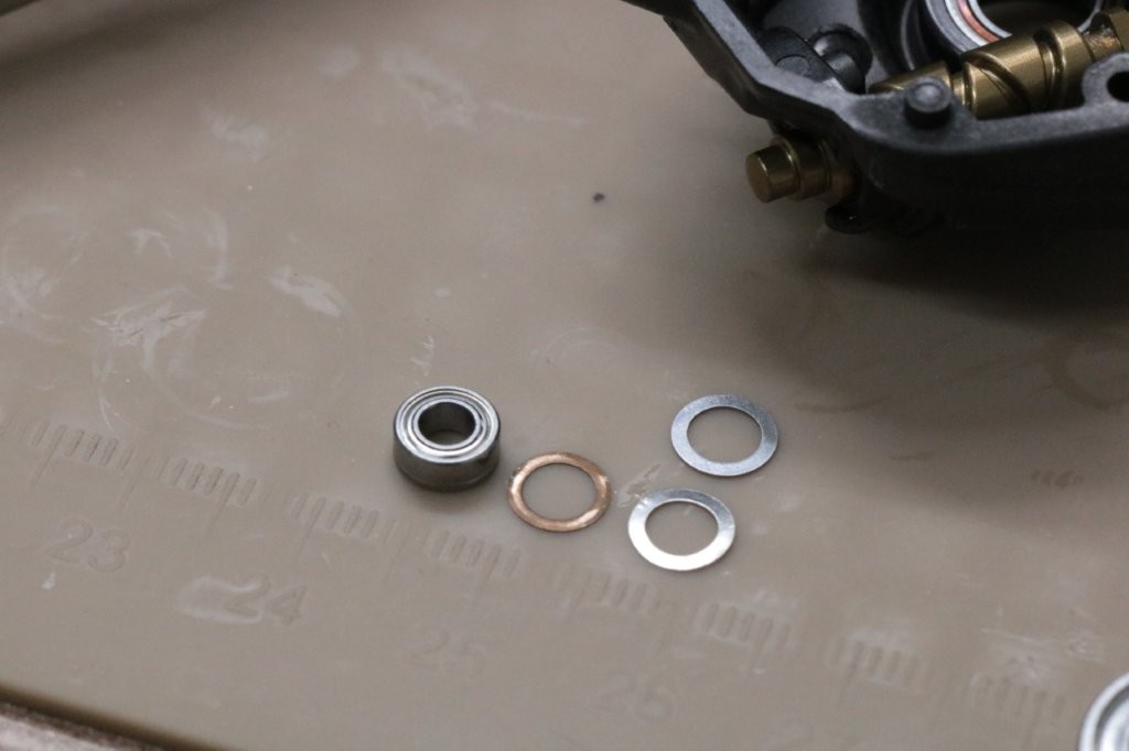 0.12mmのシムですが、0.11mmでチェック。ベアリングを交換してチェックしましたが、クリアランスはそのままのほうが良いです。ベアリングのヘタリがあるので交換しました。