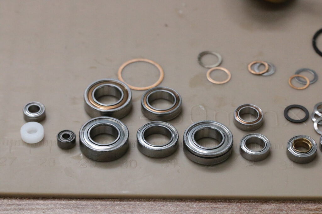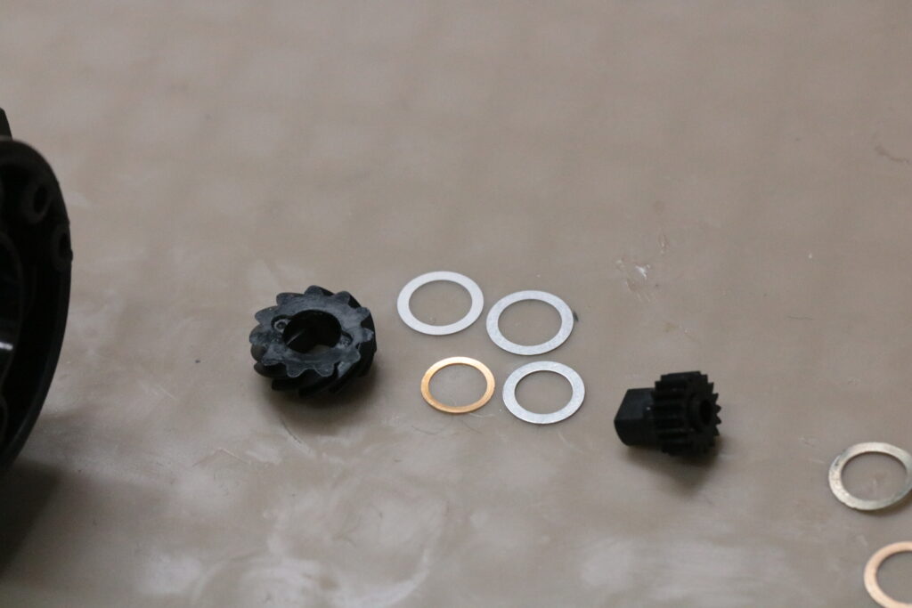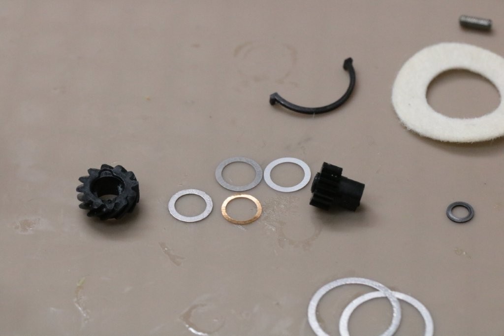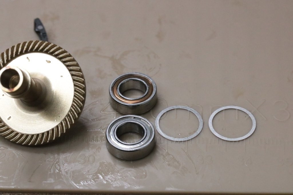 ボディベアリングを洗浄してチェックしましたが、ドライブギアボディ側とピニオンギア下をHRCBに交換します。