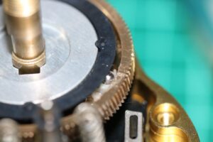 ピニオン下のウェーブワッシャーを曲げてテンションが掛かるように調整しました。
