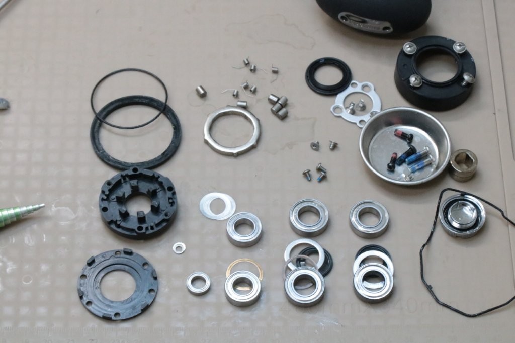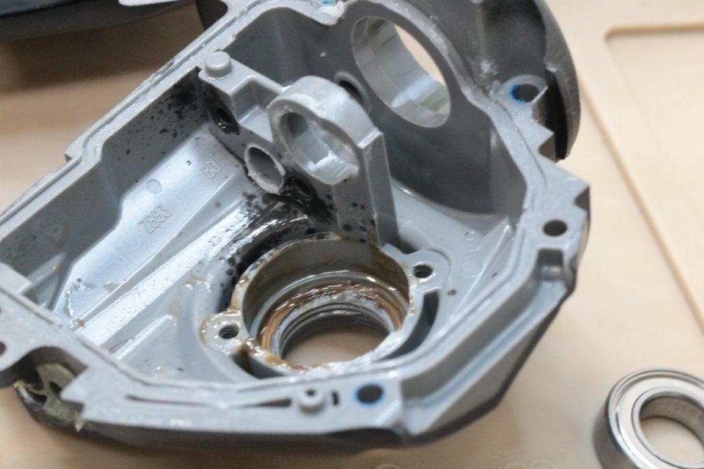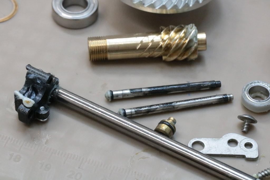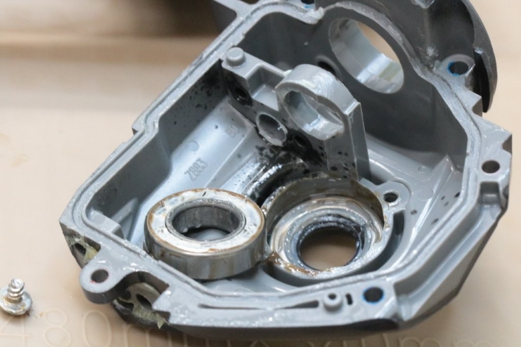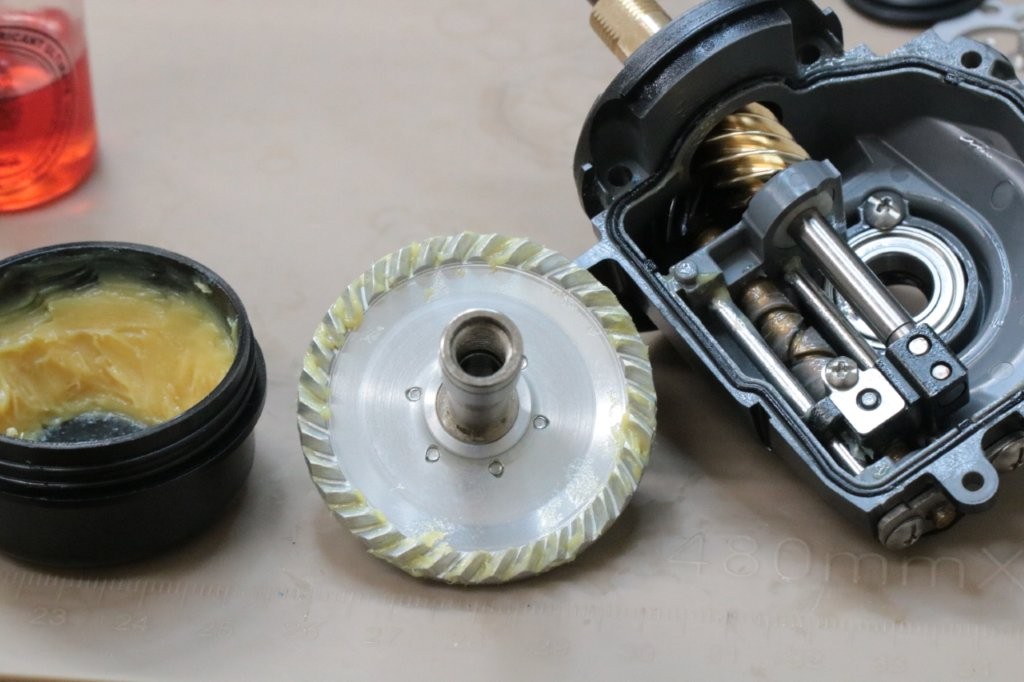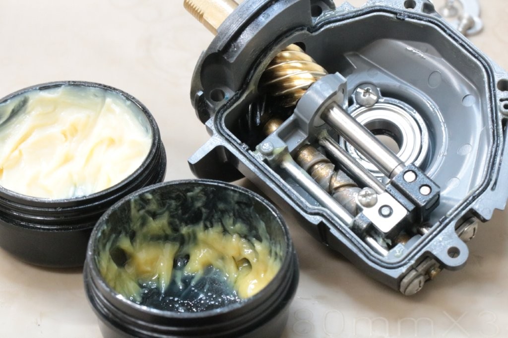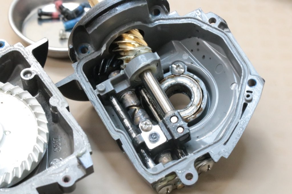 ベアリングに汚れがありますね。ウォームシャフトのグリスが少ない印象です。