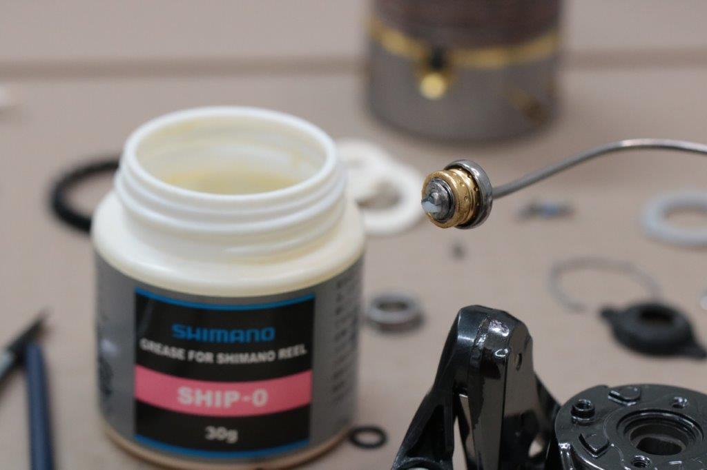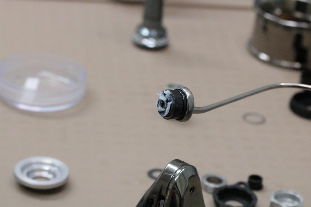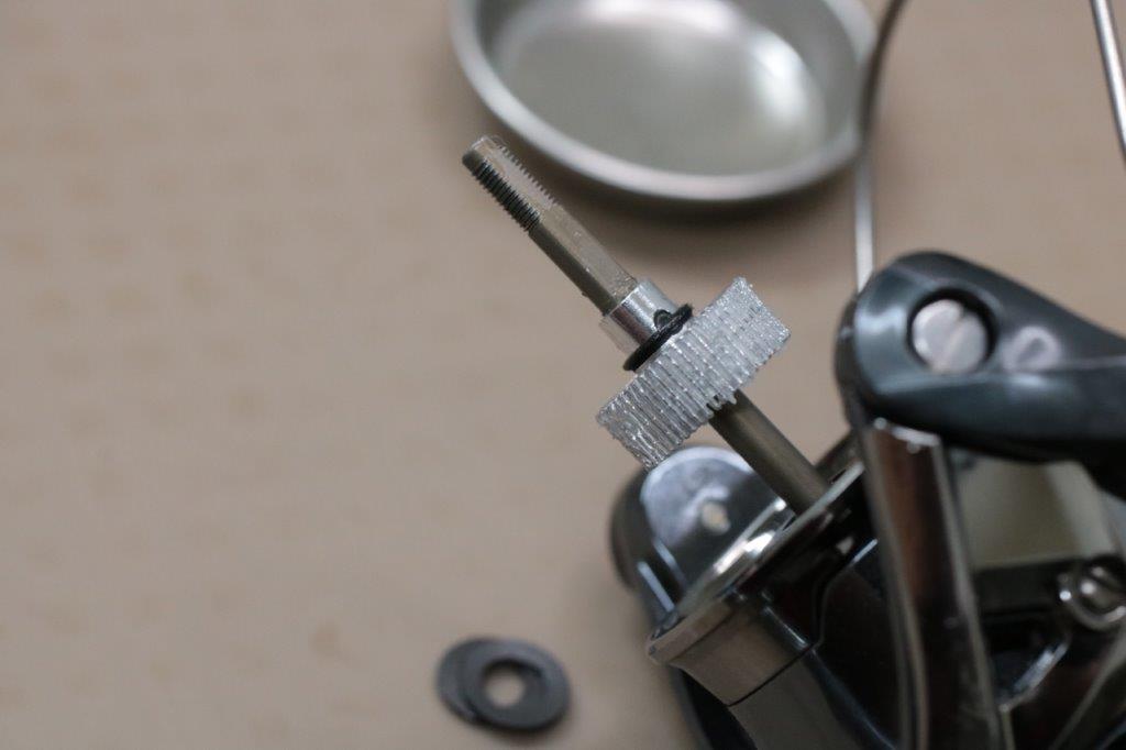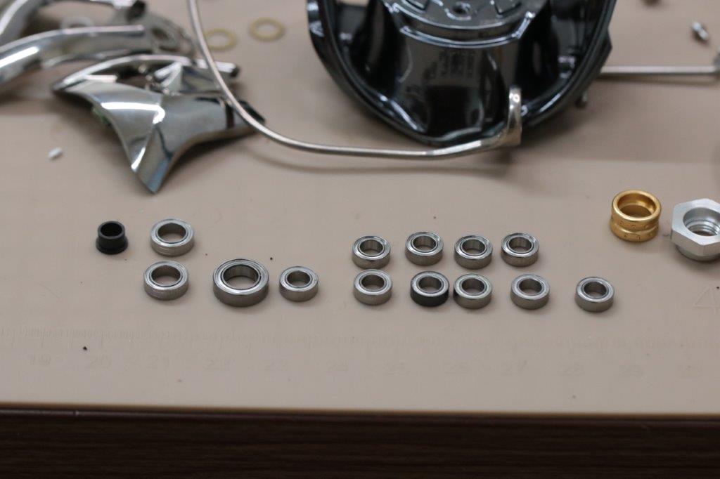 上部はローターナットベアリング、22ステラのローターナットカラー。ハンドルノブベアリング4点を交換します。