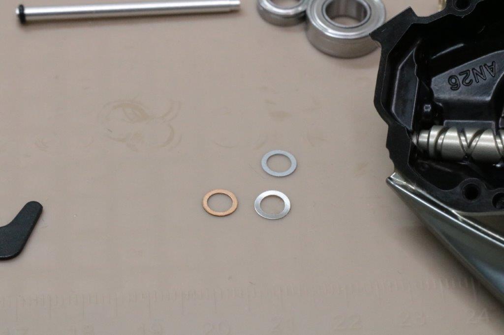 バネを抜き、クリアランスを取るためにシムを入れます。きついとよりノイズが強くなるので、かなり慎重に作業をします。