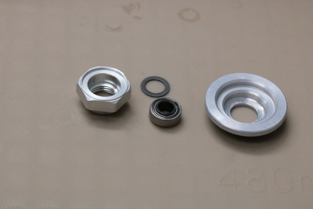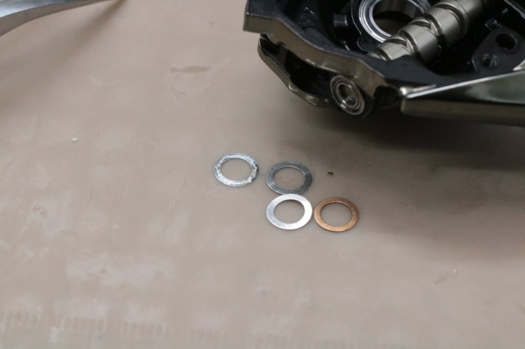 ハンドルノブは、0.5mmのシムを外側に。内側に0.2mmと0.1mmのシム。根本にアルミカラーと0.1mmシムを入れます。