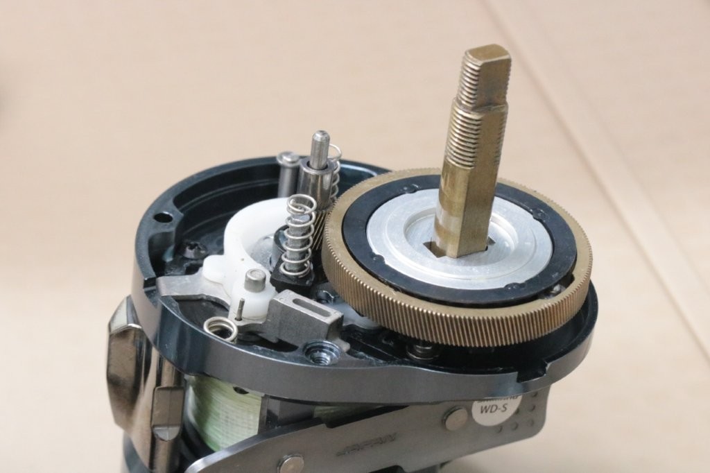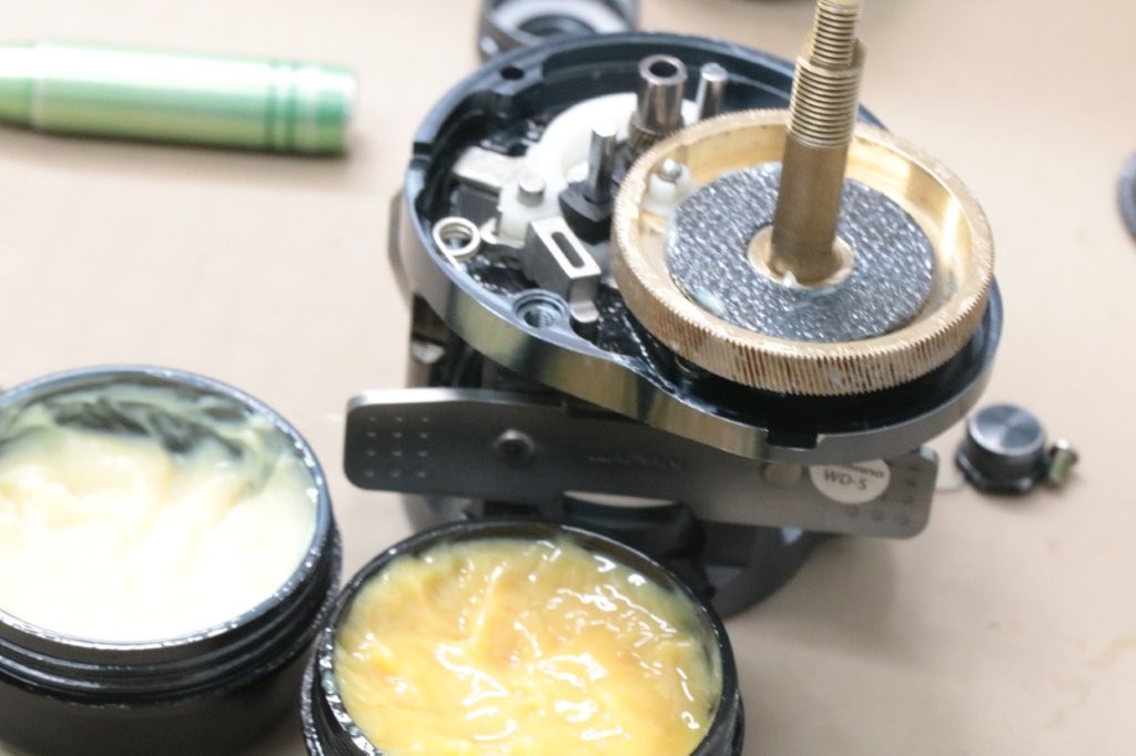 レベルワインド周りのグリスが固形化しており、ちょっと固くもたつく原因になっていますね。