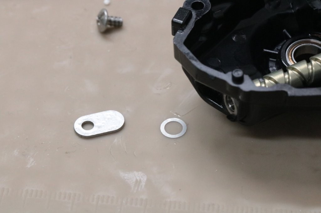 18ステラ世代よりドライブギアのベアリングのシムの位置が外シムへ変更になっております。この抑え板はシムを抜いてクリアランスがある状態ではガタが出てしまって組めないので、抑え板を抜いた状態で仕上げます。