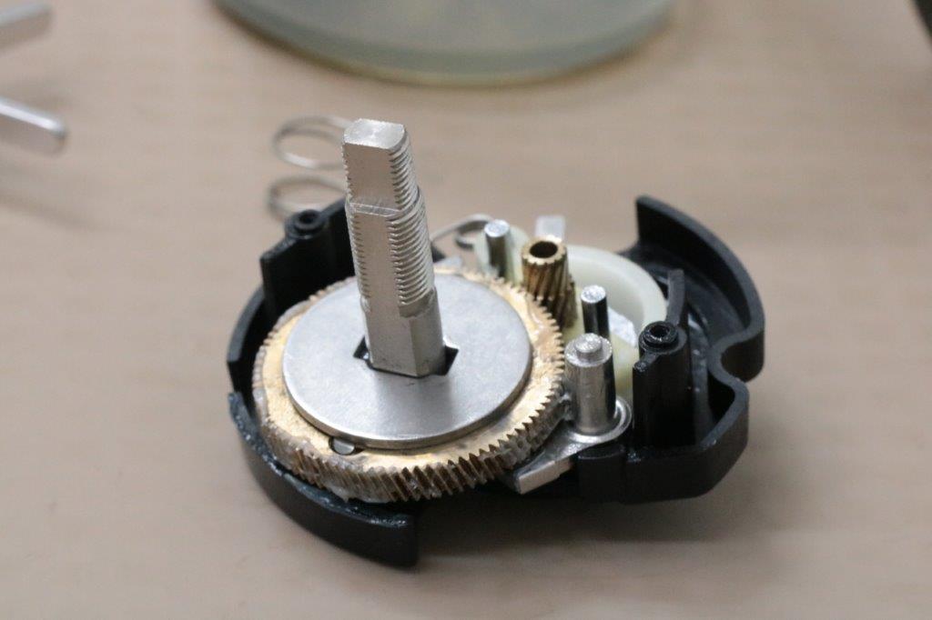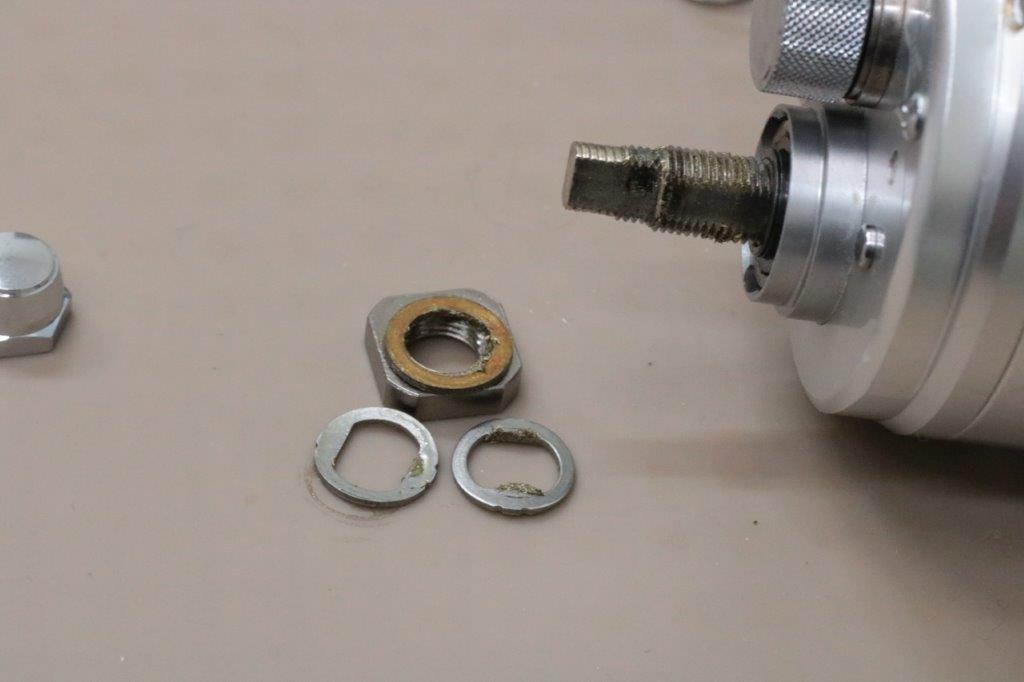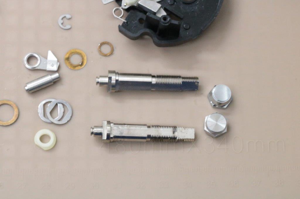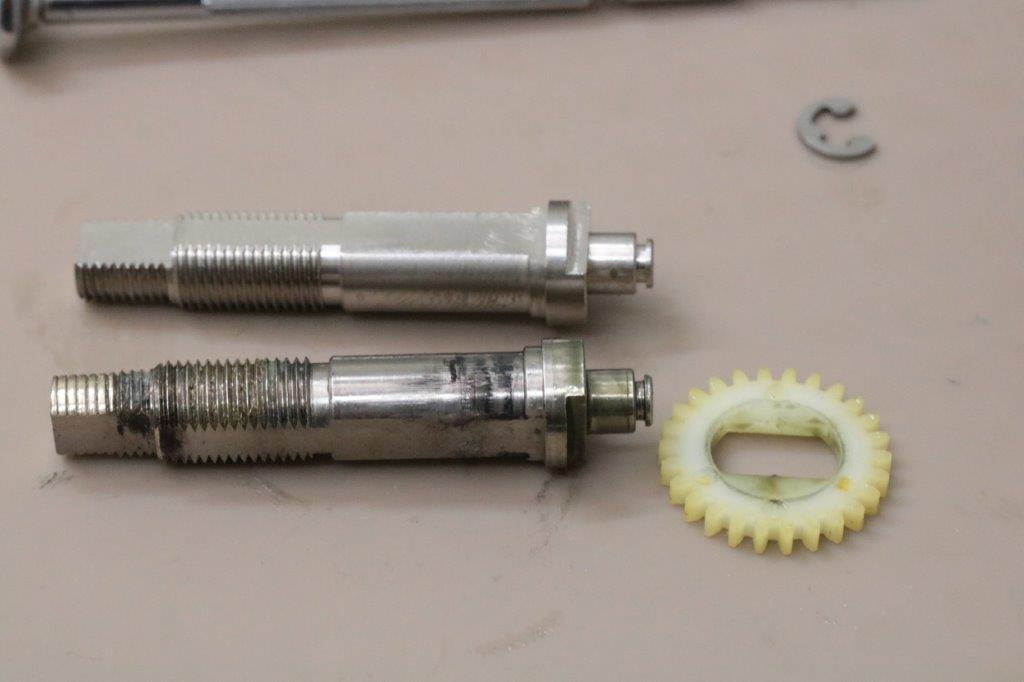 ドライブギア軸が舐めてしまっていますね。ハンドルナットも交換です。純正パーツを手配。ハンドルにはリテーナーがないため、ナットが緩みやすい状態です。