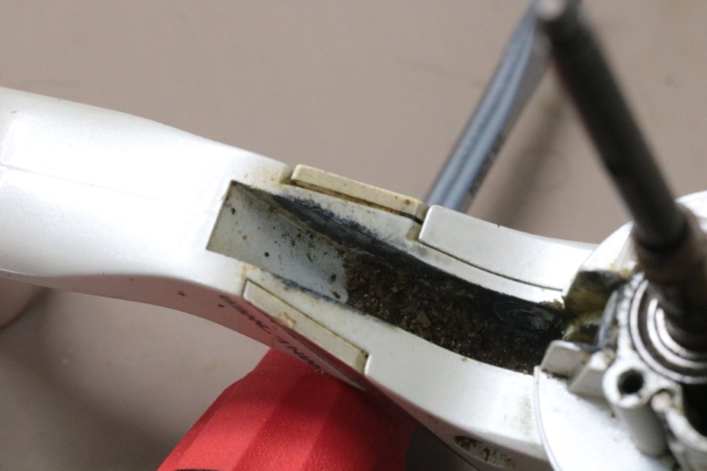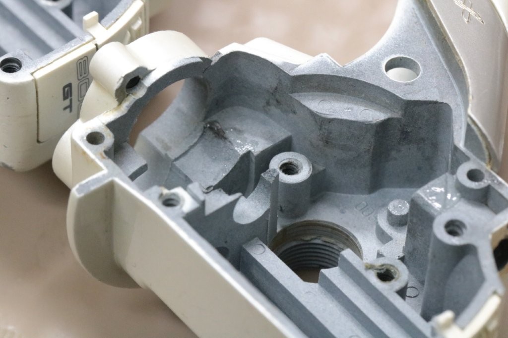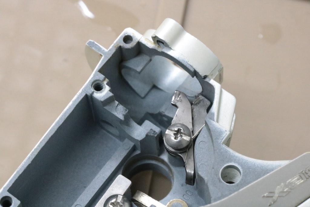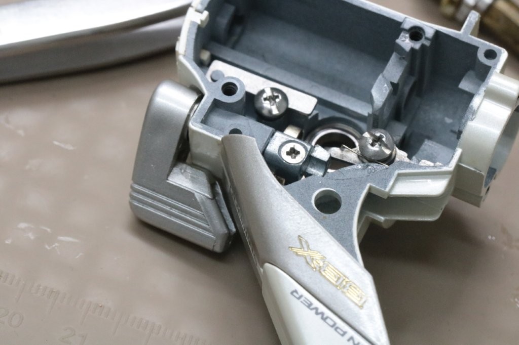 ウォームシャフトピンが脱落したことでボディを変形してしまい、内部でボディの破片が引っ掛かりレバーが破損という流れかもしれません。ウォームシャフトの遊びがかなりなくなったので、かなり印象が変わっていると思います。