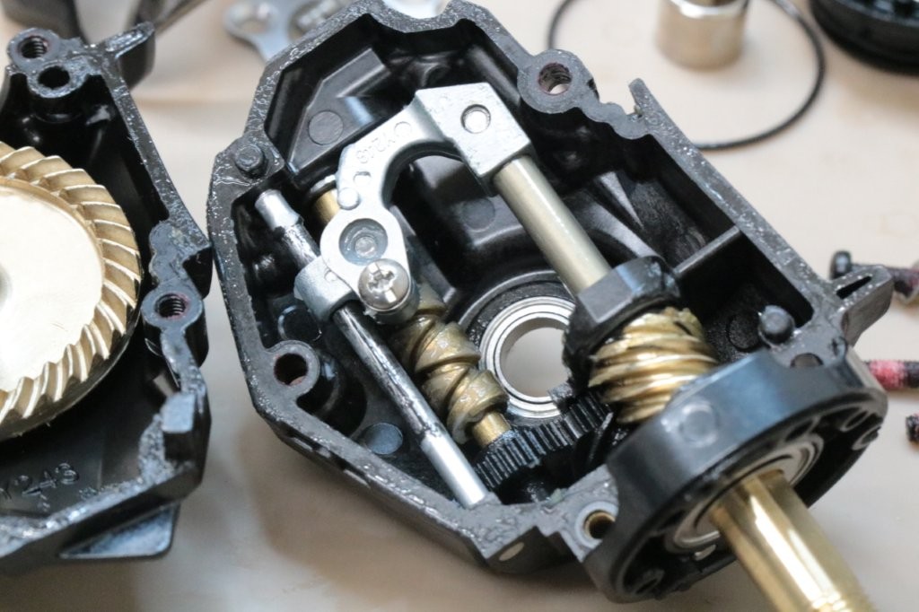 ギアは18ステラのものに置換していますが、そのギアの摩耗感が出ていました。ピニオンギアとドライブギアを押し付ける(左ハンドルの場合はボディに押し付ける状態)とざらつきを感じます。