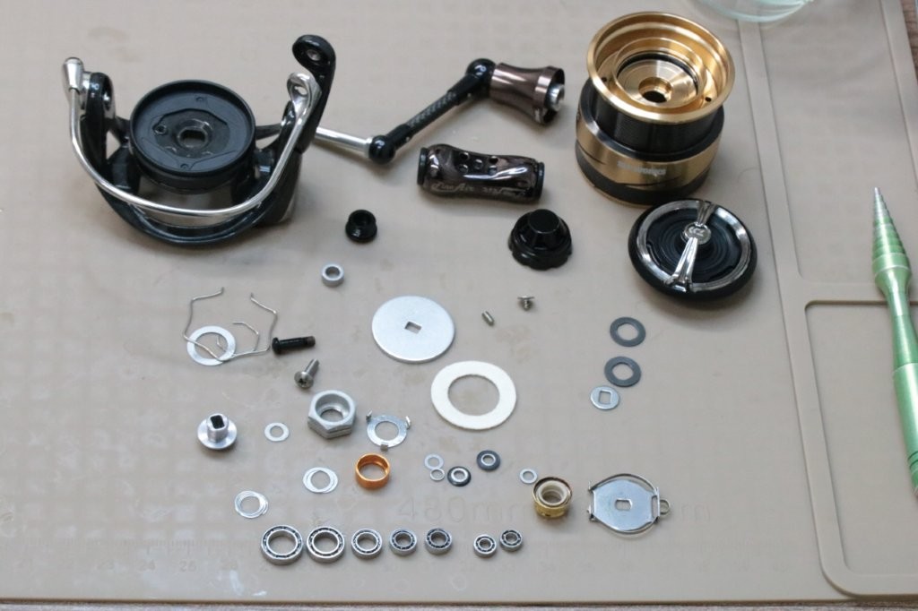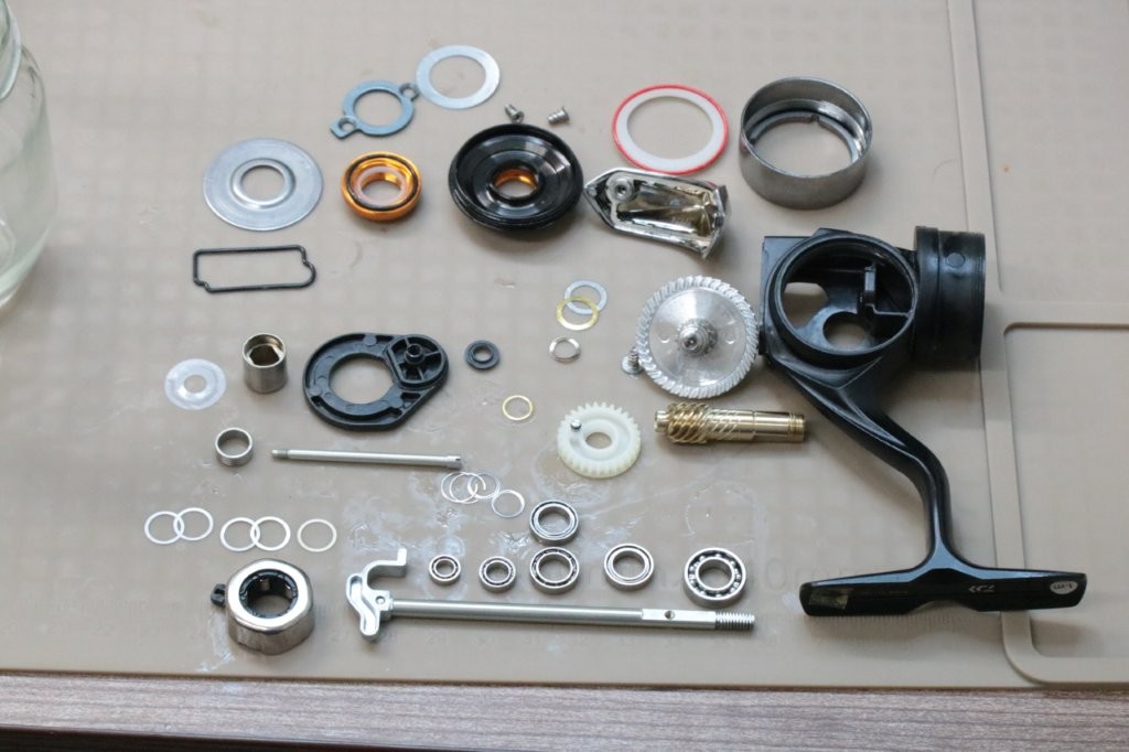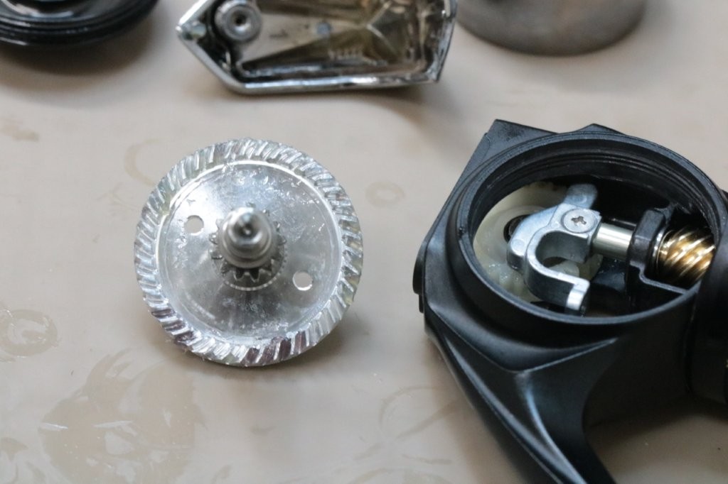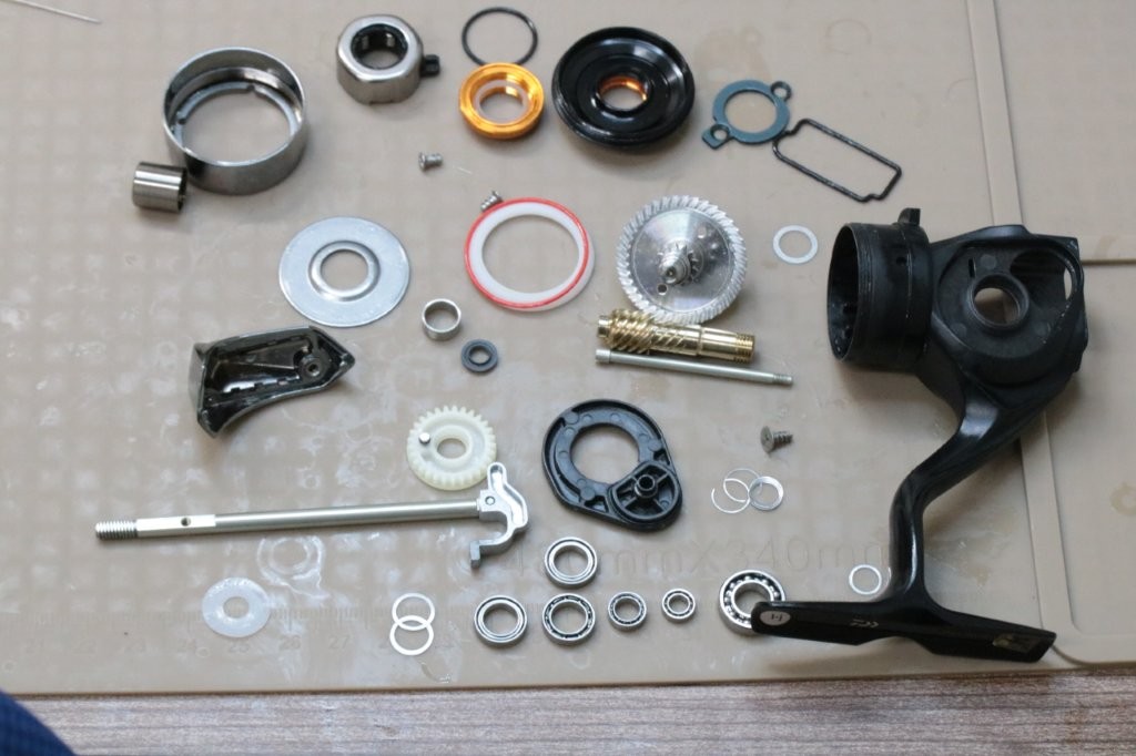 ドライブギアのハンドル側のベアリングがかなり動きが渋いので、HRCBベアリングに交換です。少し不思議なのは、ピニオンギア下のベアリングにはノイズがほとんどない状態なんです。